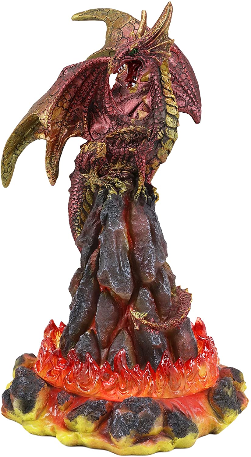 ⢠A vicious metallic red fire dragon perches atop a burning volcanic rock tower. Magma and lava fills the rock and you fire is engulfing the base of the sculptural rock formation. Turn the LED light switch on and the acrylic flame will glow steadily for a dramatic effect in the dark.