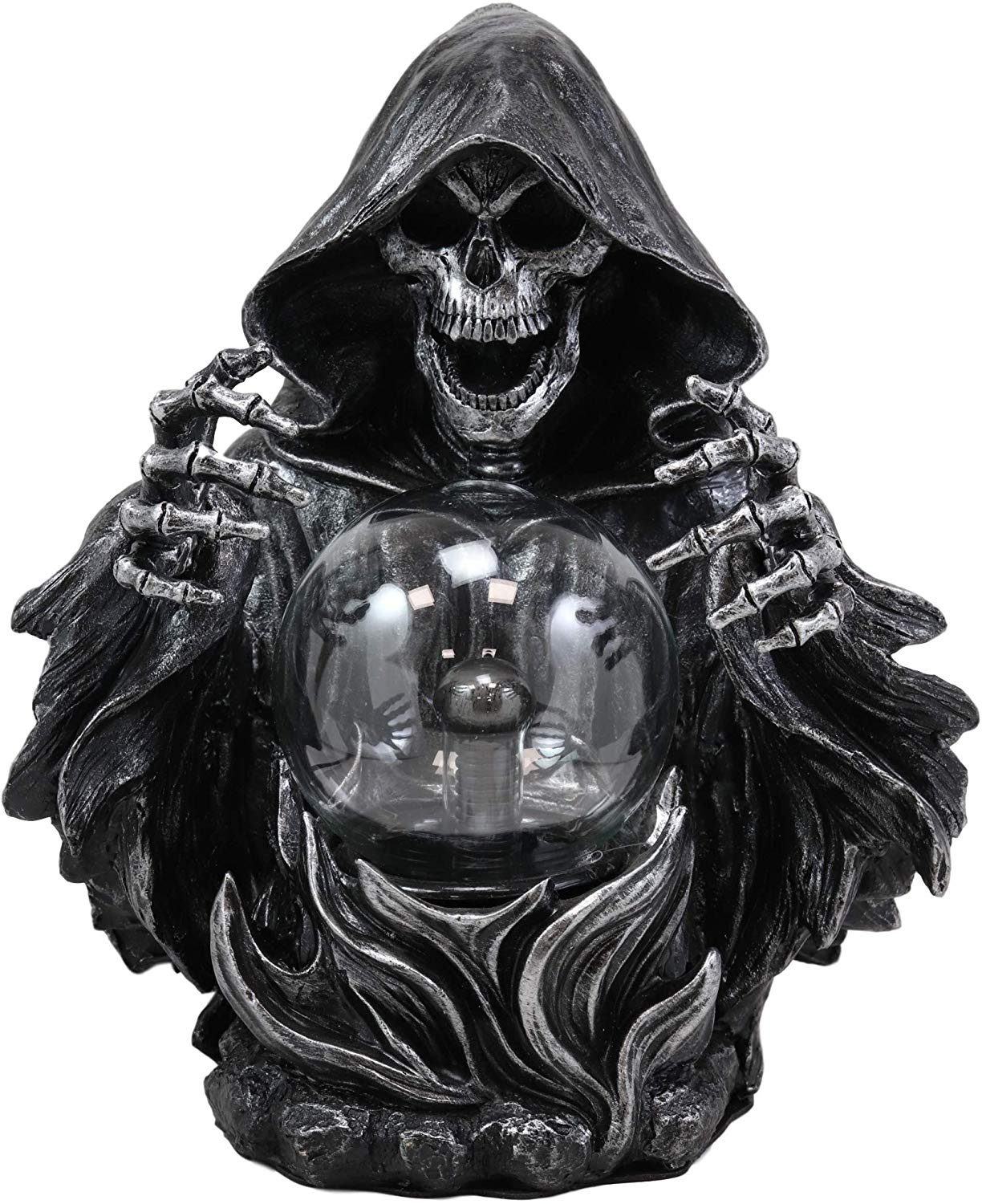 • Shrouded in the shadowy cloak of the dead, the Grim Reaper brings the unearthly presence of the underworld into your living space. The reaper's hands wrap around a glass plasma ball, looking for his next victim. With the scrying glass ball, he invokes death and upon selecting an unfortunate soul, the reaper weaves the final chapter to his/her demise.