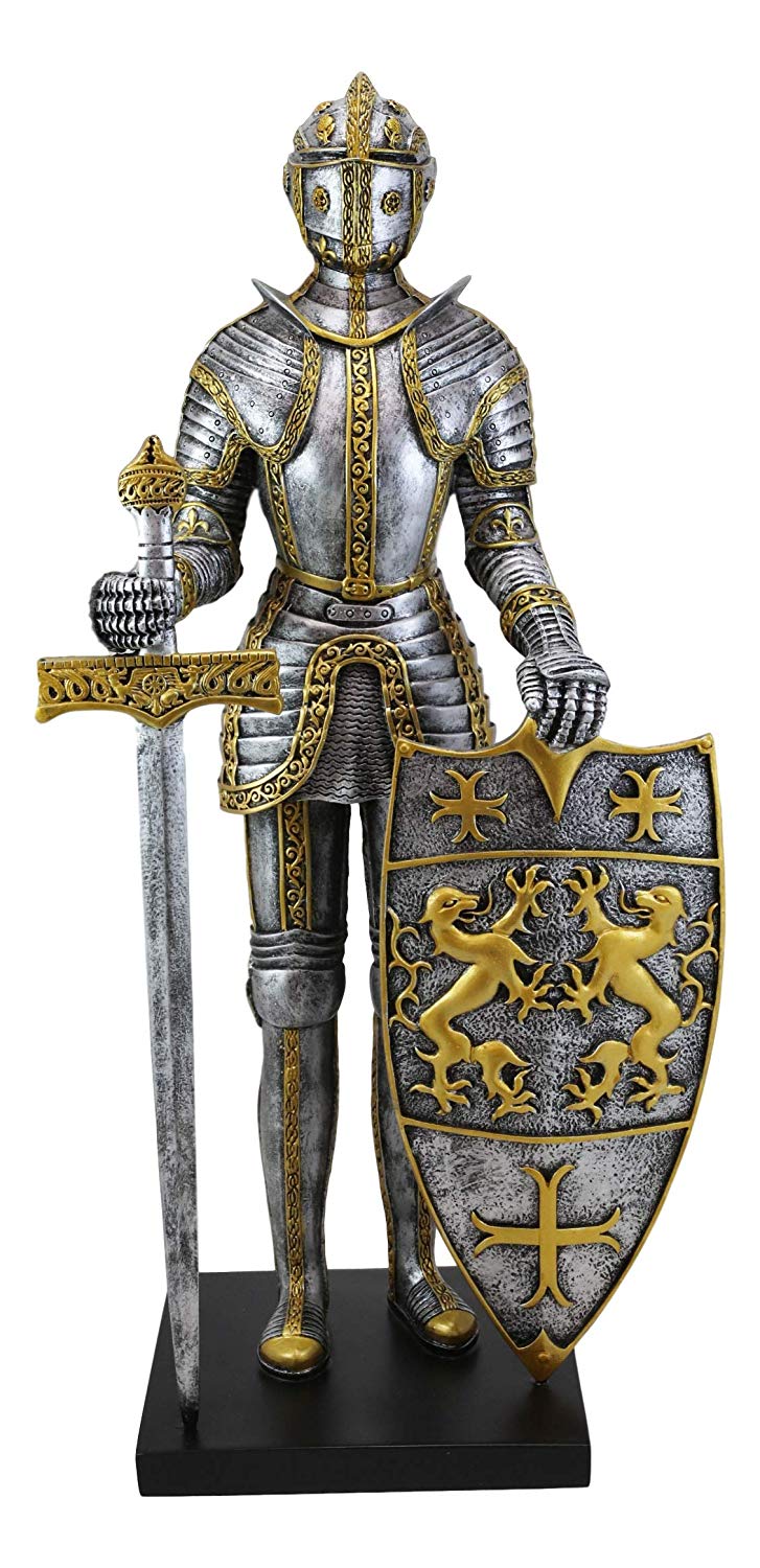 • Decorate your home with this armored royal knight! In his suit of armor, this valiant knight holds a long sword and a giant heraldry shield if his king. The fine sculpture will grace your living room, bedroom, office and library decor with an 'Old World' and a medieval charm.