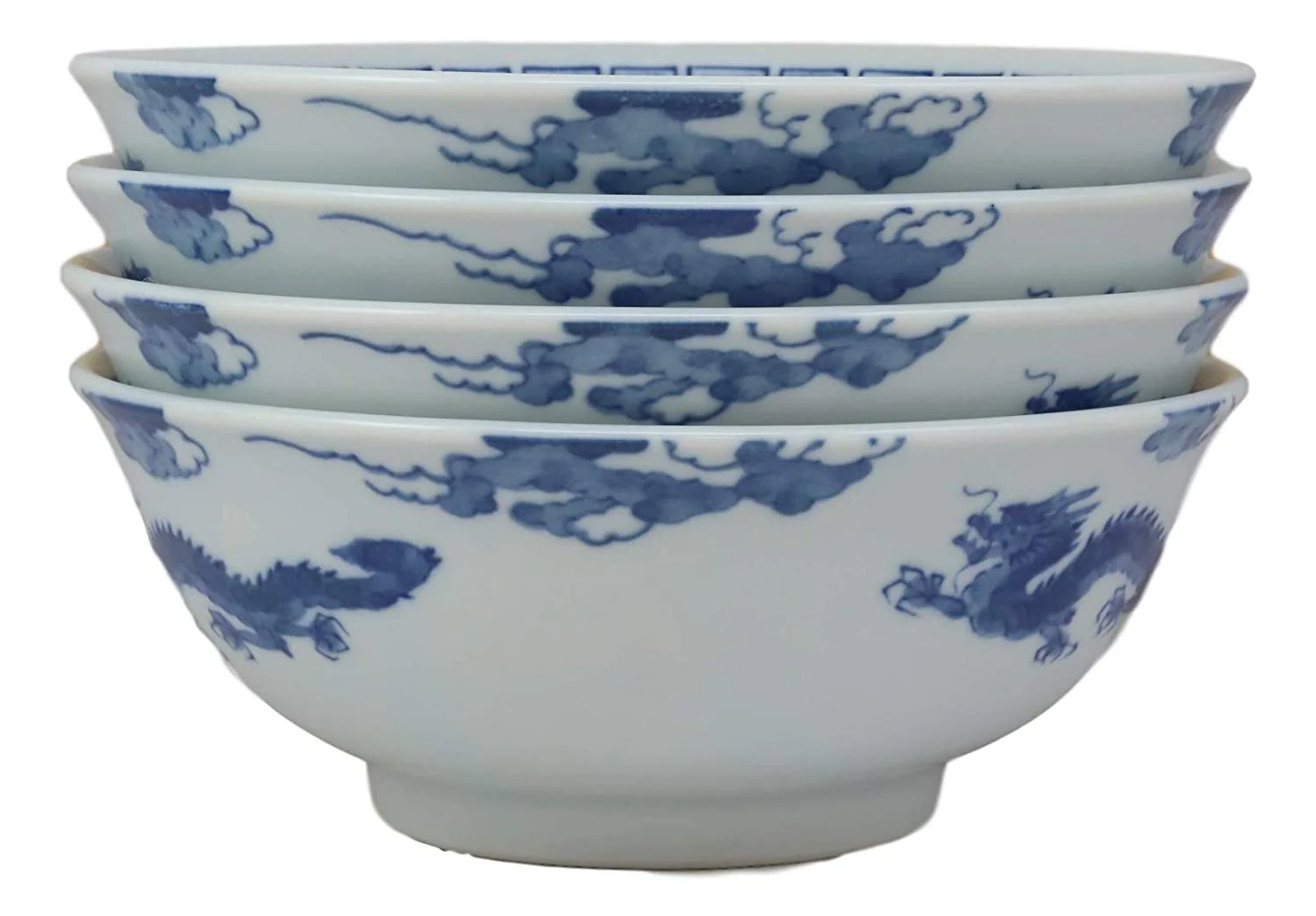 Ebros Gift Blue And White Ming Dynasty Style Feng Shui Dragons Ceramic Bowls As Ramen Pho Soup Cereal Bowl 4 Piece Set 32oz 8"Diameter—